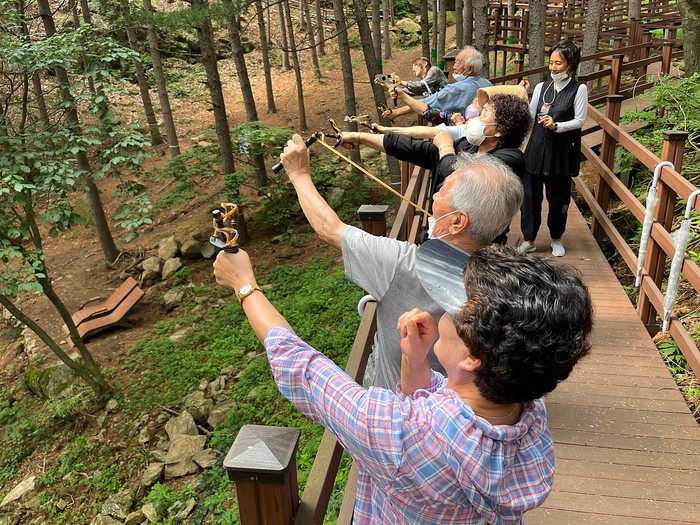 경기 동두천시 치매안심센터에서는 7월 한 달 동안 총 2회에 걸쳐 센터를 이용하는 노인 12명을 대상으로 산림치유 프로그램을 실시했다. 이번 프로그램은 실크스카프 천연 물들이기, 둘레길 걷기 등 다양한 일정을 소화했다. 사진은 참여 노인들이 새총에 스트레스 담아서 쏘기 프로그램에 참여하고 있는 모습. (사진제공=동두천시청)