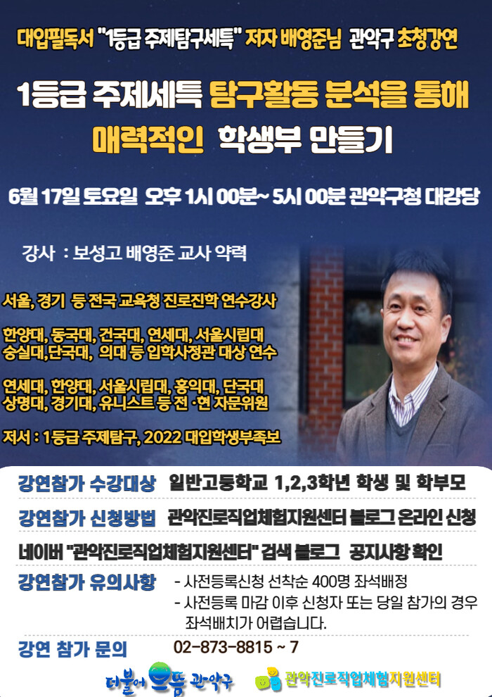 이에 구는 오는 17일 오후 1시 관악구청 대강당에서 공교육 입시전문가인 보성고등학교 배영준 강사를 초빙해 ‘1등급 주제세특(’세부능력‘과 ’특기사항‘) 탐구활동 분석을 통해 매력적인 학생부 만들기’를 주제로 ▲과목별 주제탐구 방법 ▲변화된 학생부 평가요소를 고려한 대입 수시 전략 등에 대한 강연을 개최한다.