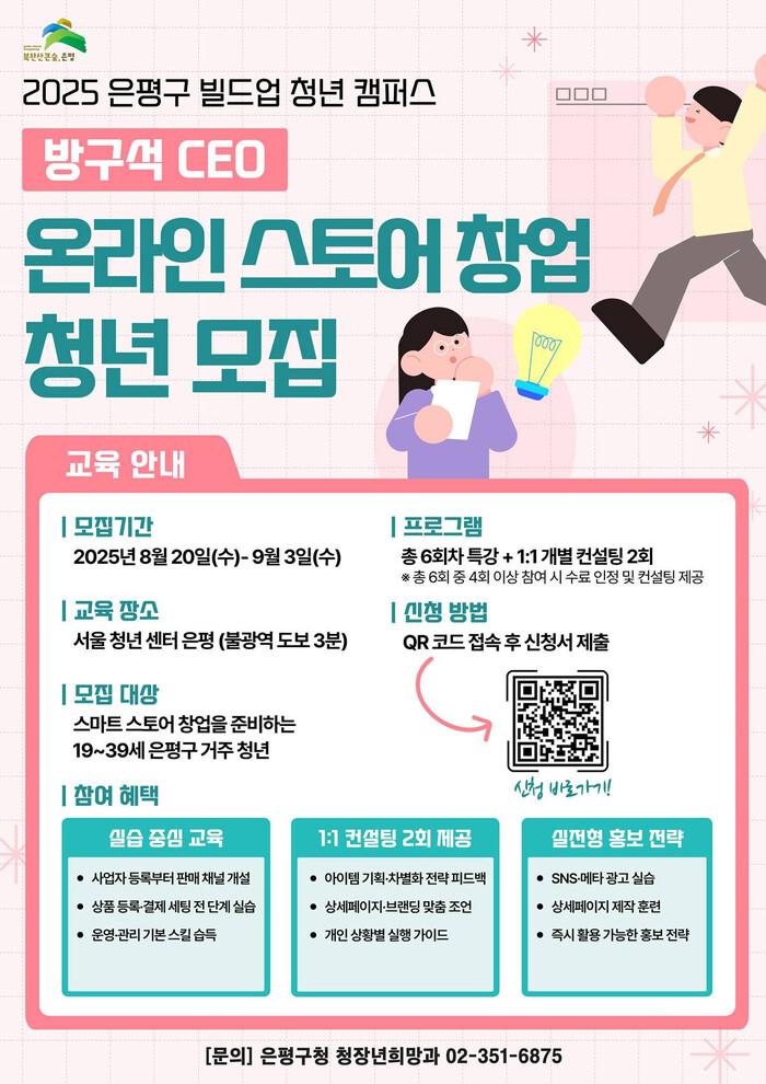 모집은 온라인 스마트스토어 창업을 희망하는 19세~39세 청년을 대상으로 진행되며, 은평구에 거주하는 청년을 우선으로 15명 선정한다. 신청을 희망하면 포스터에 있는 큐알(QR)코드를 통해 접수하면 된다. 프로그램은 내달 10일부터 주 1회 진행된다.
