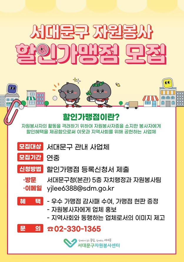 [시민일보 = 변은선 기자] 서울 서대문구 자원봉사센터가 자원봉사 활성화를 위해 2024년 신규 자원봉사 할인가맹점을 연중 모집한다.