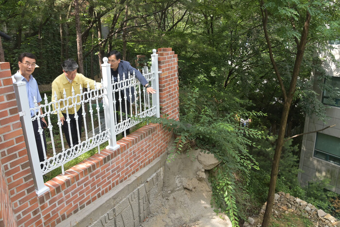 | ▲ 김길성 구청장(가운데)이 옹벽 공사 현장을 확인하는 모습 (사진=중구청 제공) |