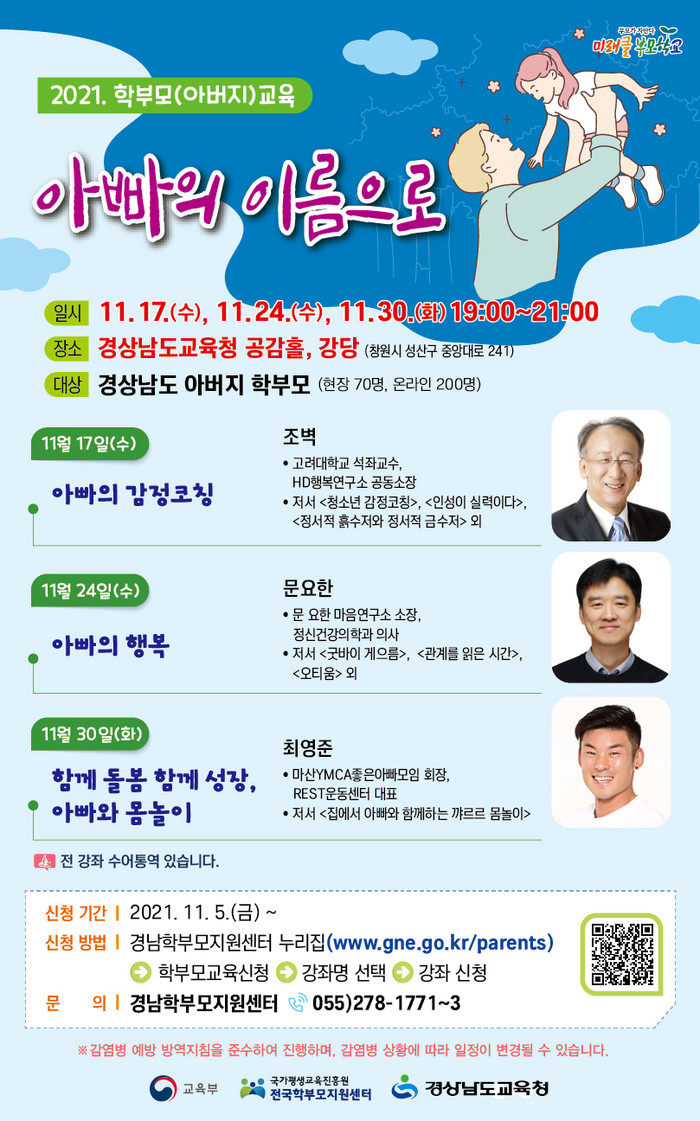 경상남도교육청(교육감 박종훈)은 11월 17일, 24일, 30일에 도교육청 공감홀에서 학부모교육 ‘아빠의 이름으로’를 개강한다.