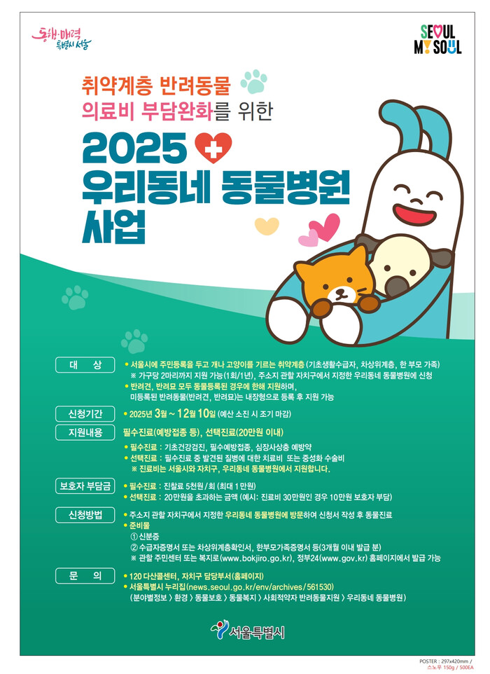 지원 대상은 구에 거주하며 반려동물을 기르는 기초생활수급자·차상위계층·한부모가족으로, 가구당 최대 2마리까지 지원받을 수 있다.