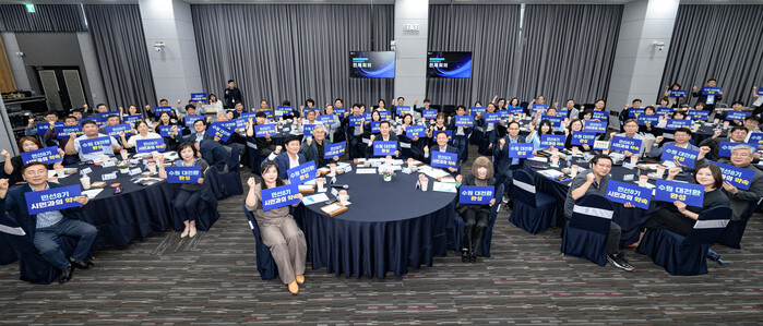 경기 수원시가 16일 시청 중회의실에서 ‘수원시 새로운수원위원회’ 전체회의를 열고, 민선 8기 공약사업 평가결과를 발표했다. 사진은 이재준 시장이 전체회의에서 위원들과 함께 기념 촬영을 하는 모습. (사진=수원시청 제공)