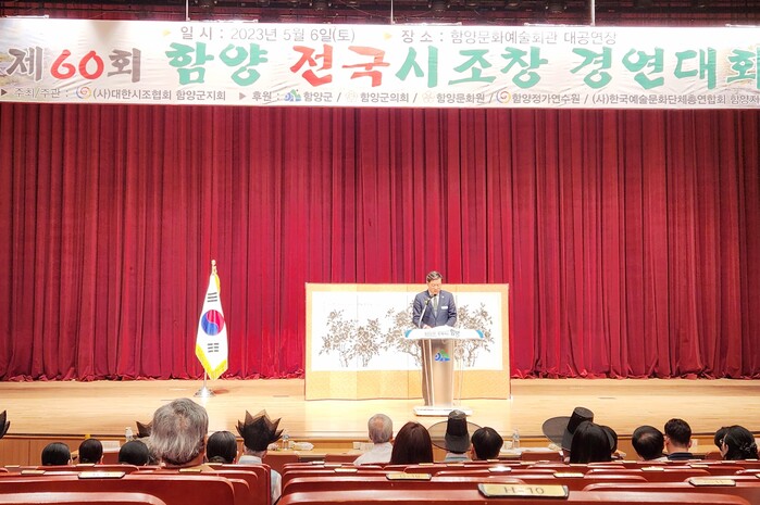 진병영 함양군수는 “역사와 전통을 자랑하는 함양전국시조창 경연대회가 60회를 맞이한 것은 시조창 동호인들의 지속적인 참여와 관심 덕분으로 우리나라를 대표하는 시조창 경연대회로 거듭나길 기원한다”라고 말했다.