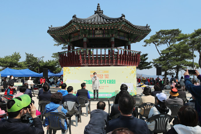 서울 성동구는 최근 개나리 명소인 응봉산 팔각정에서 ‘2022년 성동구 백일장 및 그림그리기 대회’를 대면과 비대면 방식으로 개최했다. 사진은 백일장에서 정원오 구청장(가운데)이 인사말을 하고 있는 모습.(사진제공=성동구청)
