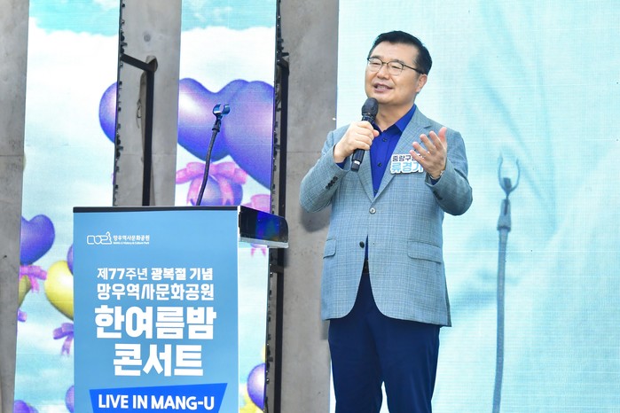 최근 중랑구가 광복절을 기념해 망우역사문화공원에 안장된 순국선열들의 숭고한 희생정신을 기리고 공원의 역사 문화적 의미를 널리 알리고자 제77주년 광복절 기념 ‘한여름밤 콘서트’를 열었다. 사진은 이날 류경기 구청장이 인사말을 하는 모습. (사진제공=중랑구청)
