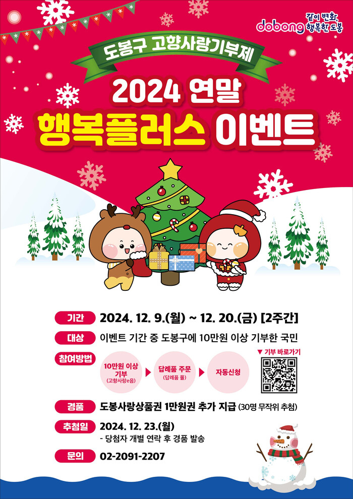 [시민일보 = 문민호 기자] 도봉구(구청장 오언석)가 9일부터 오는 20일까지 구에 10만 원 이상 기부한 국민을 대상으로 경품을 증정하는 이벤트를 진행한다.