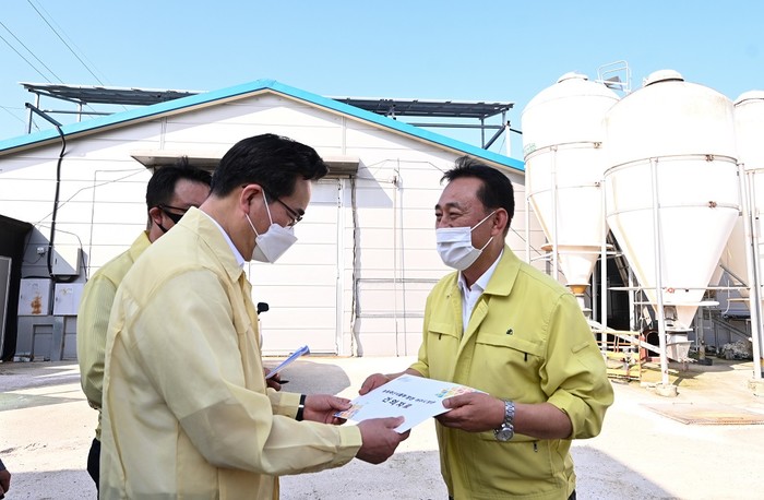 이충우 경기 여주시장은 정황근 농식품부장관과 최근 여름철 축사·농장 관리대책 현황을 살펴보고 농민들의 건의 및 애로사항을 청취하기 위해 여주시 가남읍 소재 산촌농장(육계)을 방문해 축사농가 폭염 대책 상황을 점검했다. 사진은 이 시장(오른쪽)이 정 장관에게 건의자료를 전달하고 있는 모습. (사진제공=여주시청)