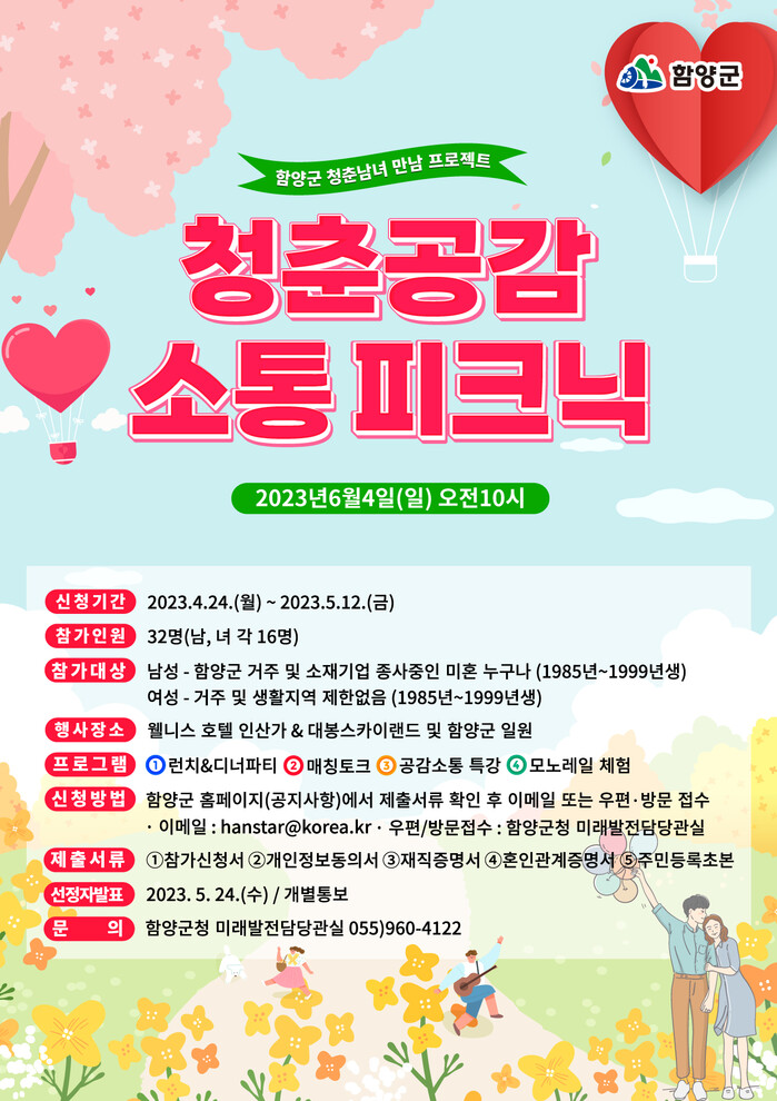 참여 대상은 함양군내 공공기관, 기업체, 농림업, 소상공업 등에 종사하는 25세 이상 39세 이하 남녀 각 16명으로, 참여를 희망하는 자는 이메일이나 우편, 방문을 통해 신청하면 된다.