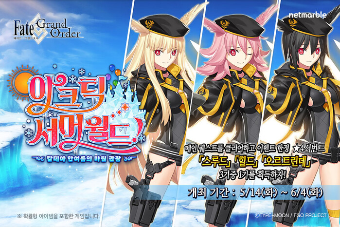 넷마블에 따르면 오는 6월 4일까지 진행하는 ‘아크틱 서머 월드! ~칼데아 한여름의 마원 관광~’은 북극권에 한여름의 테마파크가 등장하는 특이점이 발생, 이 사태를 해결하기 위해 시원한 여름 의상을 한 서번트들이 ‘아크틱 서머 월드’로 모이는 스토리 이벤트다. 메인 스토리 이벤트는 이용자의 플레이에 따라 순차 오픈되고, QP와 서번트 육성에 필요한 강화 재료 등을 획득할 수 있다.