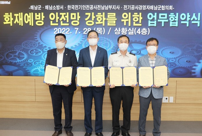 [해남=정찬남 기자] 전남 해남군이 전기화재 등 각종 화재로 인한 군민의 생명과 재산피해를 예방하고자 유관기관·단체와의 화재예방 안전망 강화를 위한 업무협약을 체결했다.