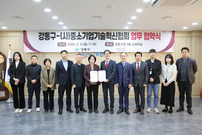 [시민일보 = 이대우 기자] 강동구(구청장 이수희)가 최근 강동구 우수 기술 산업 육성을 위해 (사)중소기업기술혁신협회(이노비즈 협회)와 업무협약을 체결했다.