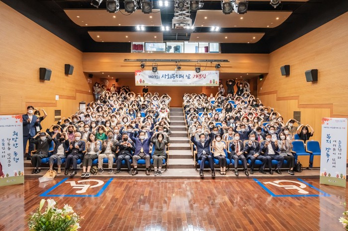 강동구는 최근 제23회 '사회복지의 날'을 기념해 사회복지 현장에서 헌신하고 있는 종사자들을 위해 사회복지 날 기념행사를 개최했다. 이날 기념 포토존 운영, 축하공연, 명사특강 및 유공 표창 등이 진행됐다. 사진은 기념행사에서 이수희 구청장(앞줄 가운데 왼쪽)이 참석자들과 기념촬영을 하고 있는 모습. (사진제공=강동구청)
