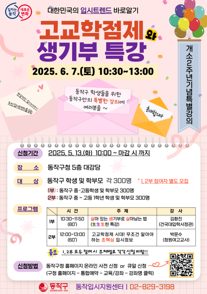 구에 따르면 이번 특강은 동작입시지원센터가 개소 2주년을 맞아 기획한 특별 강연으로, 6월7일 오전 10시30분~오후 1시 구청 대강당에서 열린다.