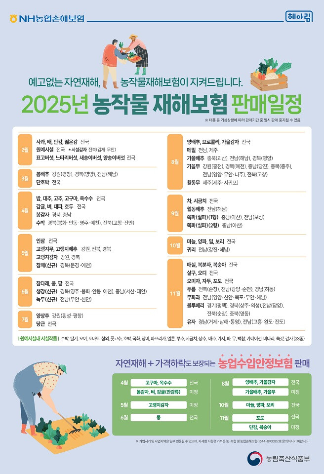 농작물 재해보험은 태풍, 가뭄, 폭설 등 자연재해로부터 농가의 소득을 보호하는 제도로, 시에서 해당 작물을 경작하며 농업경영체에 등록된 농업인(개인 또는 법인)은 신청이 가능하다. 가입을 원하는 농업인은 가까운 지역 농협을 방문해 상담 후 가입하면 된다.