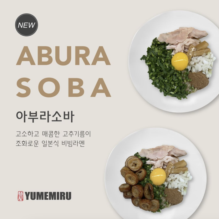 이번에 출시된 신메뉴 '아부라소바'는 매콤한 고추기름과 고소한 맛이 어우러진 일본식 비빔라멘이다. 여기에 고추기름을 추가하면 더욱 풍성한 맛을 경험할 수 있다.