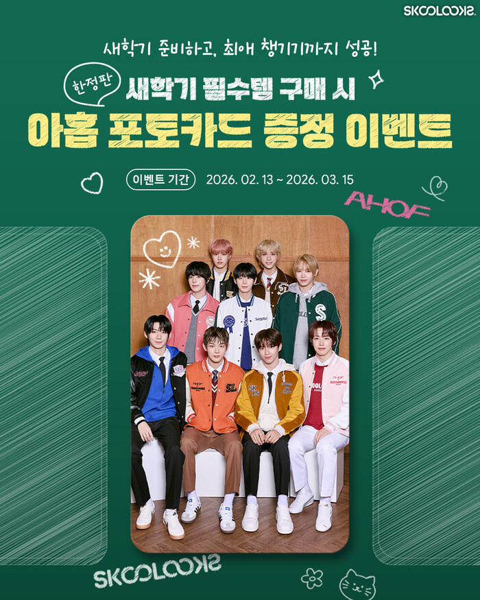 이번 이벤트는 새학기를 준비하는 학생들이 스쿨룩스만의 트렌디한 패션 교복을 체험하고, 실질적인 구매 혜택을 함께 누릴 수 있도록 기획됐다고 설명했다. 마켓스쿨에서 신학기 필수템인 패션교복과 교복 용품을 포함하여 6만 6천 원 이상 구매한 고객에게는 아홉 멤버 9인의 스페셜 포즈가 담긴 한정판 포토카드 1세트를 선착순으로 증정한다.