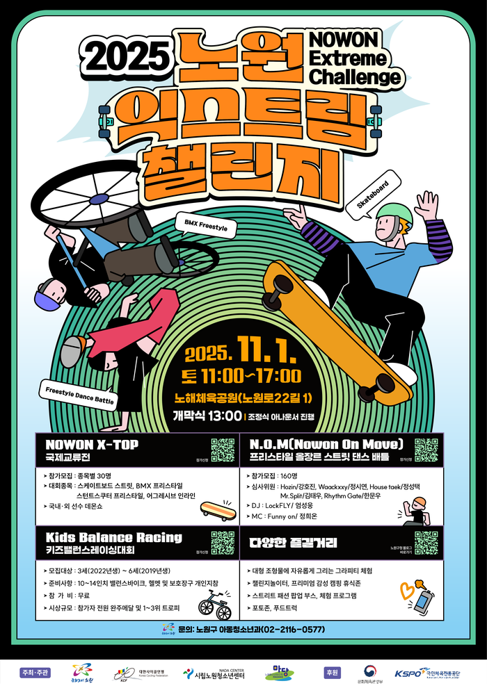[시민일보 = 박소진 기자] 서울 노원구(구청장 오승록)가 오는 11월1일 노해체육공원에서 ‘2025 노원 익스트림 챌린지(NOWON Extreme Challenge)’를 개최한다.