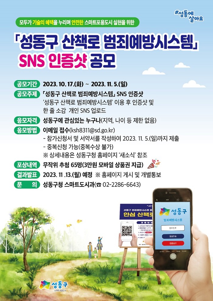 [시민일보 = 홍덕표 기자] 서울 성동구(구청장 정원오)가 오는 11월5일까지 구민의 안전한 일상생활을 위해 구에서 전국 최초로 시행한 '성동구 산책로 범죄예방시스템'에 대한 SNS 인증샷을 공모한다.