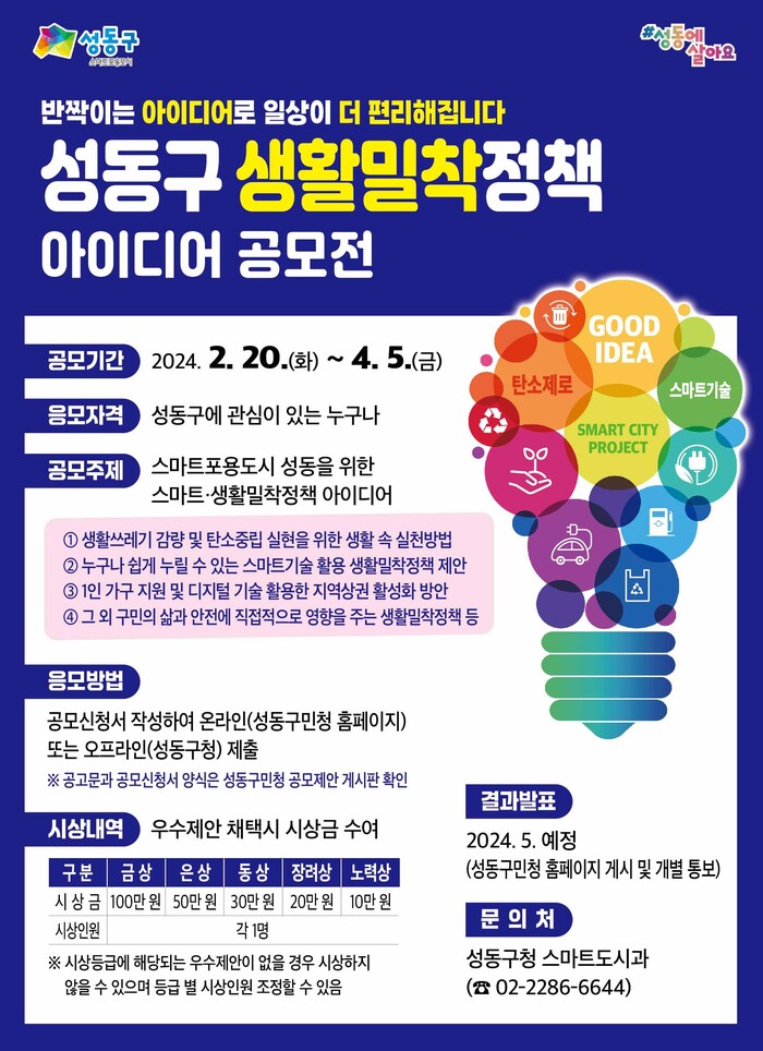 이번 공모전은 '스마트포용도시 성동을 위한 스마트·생활밀착 정책 아이디어'를 주제로 개최되며, 생활 속 다양한 분야에서 주민들의 아이디어를 접수하는 적극적인 정책소통 창구가 될 것으로 기대한다.