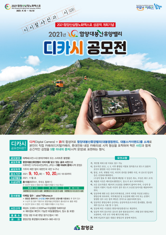 ‘디카시’란 디지털카메라와 시(詩)의 합성어로 창작자 본인이 촬영한 사진에 시를 덧붙인 창작물로 대봉산휴양밸리(대봉스카이랜드, 대봉캠핑랜드)의 자연이나 사물을 직접 카메라에 담고, 그 속에 담긴 의미를 창작시를 덧붙여 제출하면 된다.