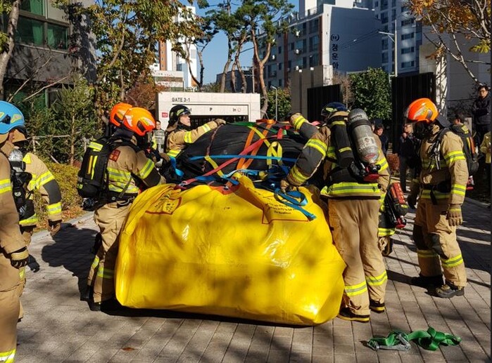 먼저 지난 7일에는 DMC센트럴자이(은평구 수색로 200) 지하주차장에서 전기차 화재 발생을 가정해 소방 훈련이 전개됐다. 화재 발생 후 질식소화덮개, 상방향 살수장치 등 전기차 소화장비 사용 시연이 이뤄졌다.