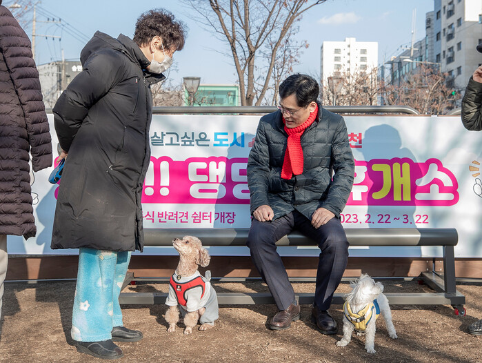 | ▲ 지난해 2월 반려견 휴게소를 찾아 구민과 소통중인 이기재 구청장(오른쪽). (사진=양천구청 제공) |