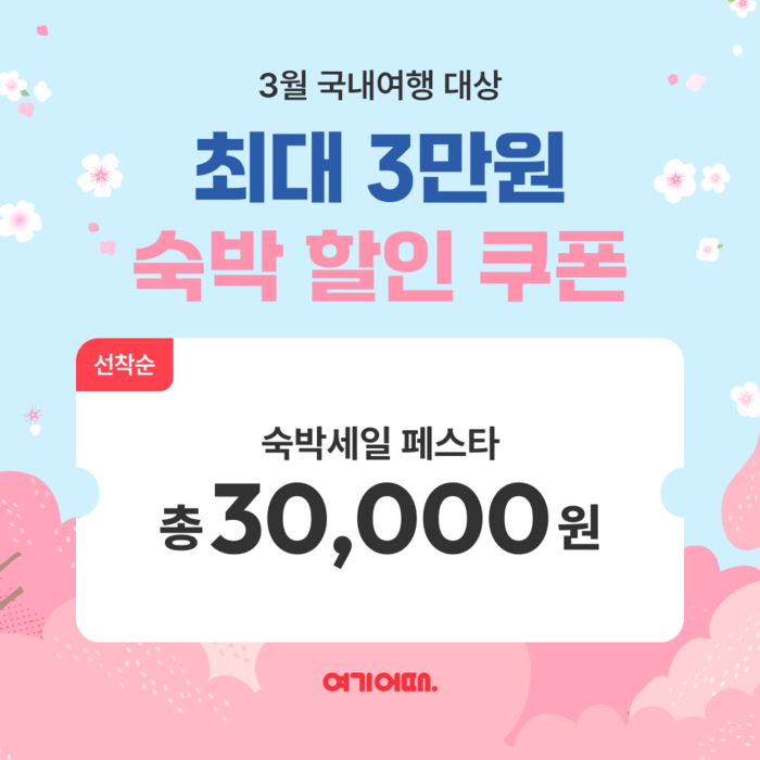 예약 대상은 여기어때 앱 내 ‘숙박 페스타’ 뱃지가 붙은 숙소이며, 체크인 기간 오는 4월 6일까지로 넉넉하다.