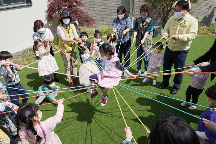 오세현 충남 아산시장이 제100회 어린이날을 맞이해 지난 4일 아산시 육아종합지원센터와 아동양육시설인 아인하우스를 방문했다. 이날 아산시육아종합지원센터는 ‘육아종에서 놀자’라는 부모·자녀 체험 놀이와 카시트 나눔 행사를, 아인하우스는 에어바운스 놀이 프로그램을 진행했다. 사진은 오 시장(오른쪽)이 아이들과 에어바운스 놀이를 함께하고 있는 모습. (사진제공=아산시청)