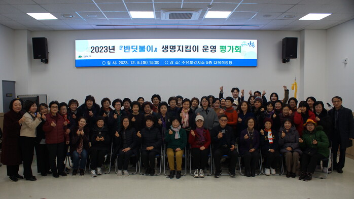 | ▲ 지난 5일 수유보건지소에서 열린 ‘2023년 반딧불이 생명지킴이 운영 평가회’에서 관계자들이 기념촬영을 하고 있다. (사진=강북구청 제공) |