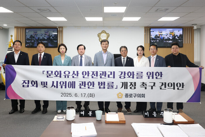 [시민일보 = 이대우 기자] 서울 종로구의회(의장 라도균)가 최근 제342회 정례회 제2차 본회의에서 박희연 의원이 대표발의한 ‘문화유산 안전관리 강화를 위한 집회 및 시위에 관한 법률 개정 촉구 건의안’을 채택했다.