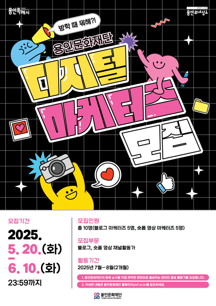 [용인=오왕석 기자] 용인문화재단은 시민의 시선으로 문화예술 소식을 전달하고 디지털 시대에 발맞춘 콘텐츠를 생산하고자, 온라인 홍보 활동가인 ‘2025 용인문화재단 디지털 마케터즈’를 모집한다고 20일 밝혔다.
