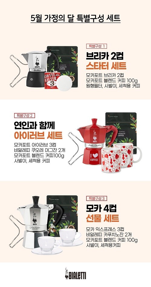 이번 라이브를 통해 선보일 가정의 달 특별 구성은 크게 4가지로 나뉜다. 모카포트 첫 이용자를 위해 구성된 스타터 세트는 베스트셀러 ‘뉴 브리카’ 와 ‘뉴 비너스’ 중 선택이 가능하며, 함께 사용 가능한 사발이, 원형 필터, 모카포트 커피까지 포함되어 있다. 연인과 함께 세트는 귀여운 ‘I love coffee♥’ 로고로 하트 머그잔 구성이며, 에스프레소 잔 세트, 카푸치노 잔 세트는 이태리 모카포트의 시초 ‘모카 익스프레스’ 모델로 선택의 폭을 다양화했다.