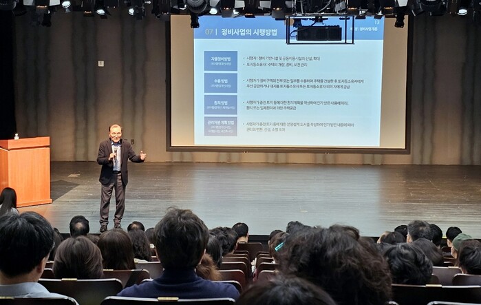 최근 북아현문화체육센터 아트홀에서 진행된 1회차 강의는 250명에 달하는 수강생들의 열기로 가득 찼으며, 김용호 제일엔지니어링 부회장이 ‘정비계획 및 구역지정 절차’를 주제로 2시간 동안 열정적으로 강의했다.