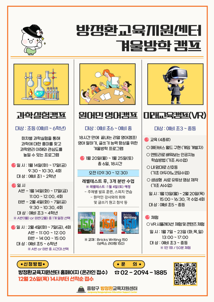 [시민일보 = 여영준 기자] 중랑구(구청장 류경기) 방정환 교육지원센터가 다가오는 2025년, 겨울방학을 맞아 학생들과 학부모를 위한 특별한 프로그램을 제공한다.