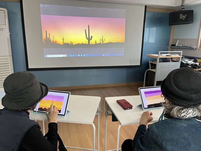 | ▲ 지난해 청파노인종합복지관에서 '아이 라이크 아이티' 프로젝트 중 하나인 디지털드로잉 수업에 참여하고 있는 노인들의 모습. (사진제공=용산구청) |