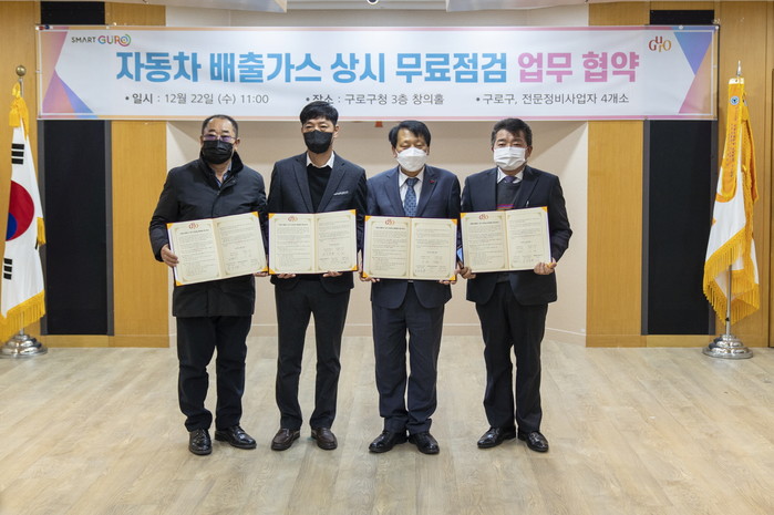구로구는 최근 지역내 공단서비스센터·솔로몬자동차공업사·쌍용자동차 서울서비스센터·현대카공업사 등 전문 정비사업자와 ‘자동차 배출가스 상시 무료점검’ 업무협약식을 개최했다. 협약으로 사업자는 운행차 배출허용기준 초과 여부 무료점검 등을 이행한다. 사진은 협약식에서 이성 구청장(오른쪽 두 번째)과 관계자들이 기념촬영을 하는 모습. (사진제공=구로구청)