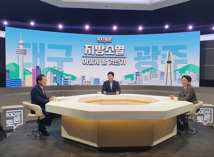| ▲ 강기정 광주광역시장 당선인과 홍준표 대구광역시장 당선인이 21일 MBC 100분 토론에 출연해 지방소멸 극복과 균형발전정책에 대해 토론을 펼치고 있다. / 강기정 당선인 홍보팀 제공 |