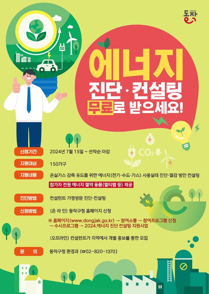 | ▲ 동작구(구청장 박일하)는 생활 속 온실가스 감축을 실천하고 ‘무료 에너지 진단·컨설팅’을 추진한다. 사진은 관련 홍보 포스터 (사진=동작구청 제공) |