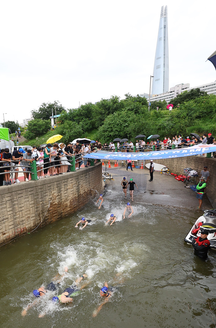 31일 서울 송파구 잠실한강공원 일대에서 열린 제18회 서울특별시 아쿠아슬론대회에 참가한 학생들이 레이스를 펼치고 있다.