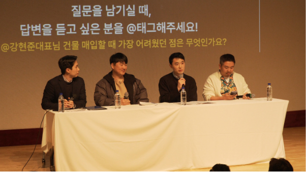 세미나 2부 마지막에는 ‘건물주가 된 선배들의 이야기’라는 주제로 3명의 자영업자 건물주들이 출연하여 토크쇼가 진행되었다. 세미나 1부에서 ㈜건물에진심 이창헌 대표가 강연에서 건물주가 된 실제 사례로 소개했던 족발집, 곰탕집, 타이 음식점을 운영하는 대표들이 실제로 등장해 수강생들의 뜨거운 관심을 받았다.