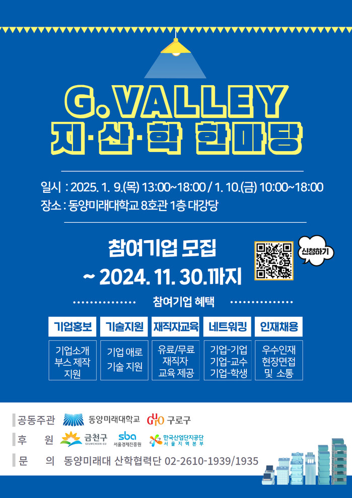 [시민일보 = 박소진 기자] 구로구(구청장권한대행 엄의식)가 2025년 1월9일부터 10일까지 이틀간 동양미래대학교에서 열리는 ‘제1회 G밸리 지·산·학 한마당’에 참여할 G밸리 소재 기업을 이달 30일까지 모집한다.