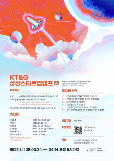KT&G는 교육 비용 전액을 지원하며 우수 팀들에게는 상금을 비롯해 서울 성수동에 위치한 청년창업 공간인 ‘KT&G 상상플래닛’ 입주 지원과 투자 유치 연계 등 경쟁력 강화를 위해 후속 지원할 것이다.