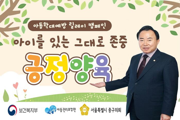[시민일보 = 여영준 기자] 서울 중구의회 소재권 의장이 지난 20일 아동학대 예방 릴레이 캠페인‘아이를 있는 그대로 존중, 긍정양육’에 참여했다.