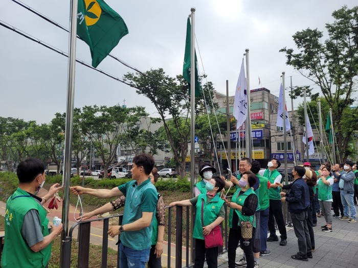 경기 안산시 단원구 와동 새마을회는 최근 나라사랑의 정신을 고양하고 새마을정신을 함양하고자 선부동과 이어지는 와동의 주요 관문이자 시민 통행이 많은 화정5교에 태극기와 새마을기를 설치했다. 사진은 이날 회원들이 태극기와 새마을기를 설치하고 있는 모습.(사진제공=안산시청)