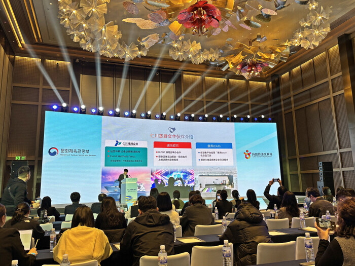 | 2026 칭다오 K-관광 로드쇼에서 인천항만공사가 소개되고 있다. [사진=인천항만공사] |