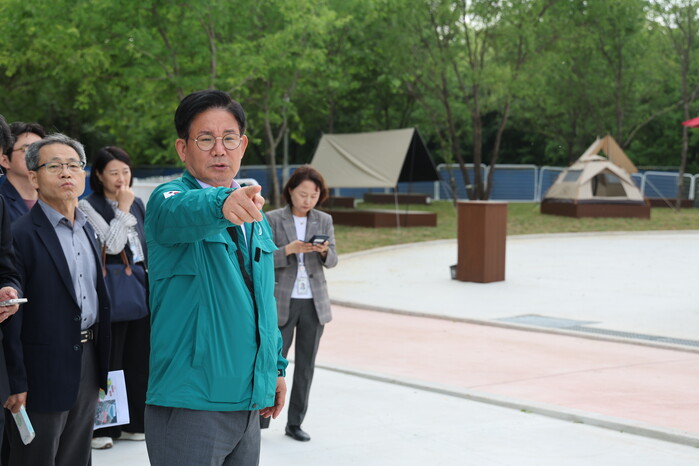이날 박강수 마포구청장은 반려동물이 마음껏 뛰어놀 놀이터와 캠핑데크, 반려견 화장실 등 캠핑장 곳곳을 점검하고 안전에 대한 당부를 전했다.