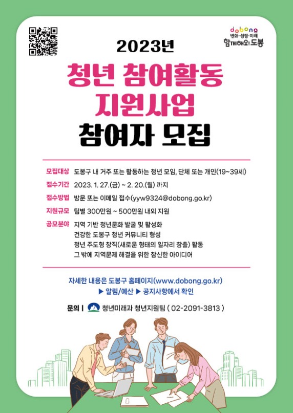 [시민일보 = 박준우 기자] 서울 도봉구(구청장 오언석)가 오는 20일까지 '청년 참여활동 지원사업'에 참가할 청년을 모집한다.