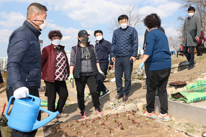 서울 도봉구는 최근 주민들에게 도시농업의 기회를 제공하고자 쌍문동 친환경 나눔텃밭(쌍문동442-1), 초안산 근린공원 나눔텃밭(창동 산154-1), 세대공감 텃밭(창동 산177) 총 3곳의 친환경 나눔텃밭을 개장했다. 사진은 초안산 근린공원 나눔텃밭을 방문한 이동진 구청장(오른쪽 두 번째)이 주민들과 대화를 나누고 있는 모습. (사진제공=도봉구청)